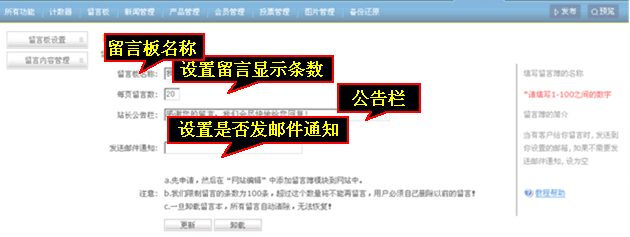 在留言本设置主要填写留言板名称设置每页留言数设置站长公告栏设置发邮件通知(当有客户给你留言时, 发送到您设置的邮箱, 如果不需要发送邮件通知, 设为空),点击“更新”便完成留言板设置。